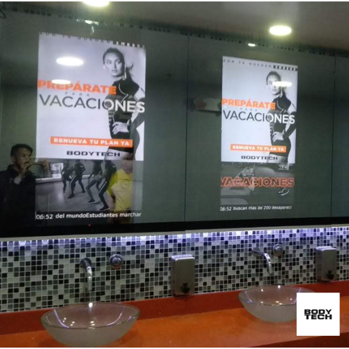 Presentamos nuestros espejos interactivos, ubicados en los baños de los más prestigiosos centros comerciales y gimnasios de Bogotá. Una oportunidad única para marcas visionarias: al acercarse, el usuario descubre mensajes y pautas personalizadas. Lleva tu branding al siguiente nivel con una interacción íntima e innovadora. ¡Haz que tu marca sea inolvidable en cada mirada